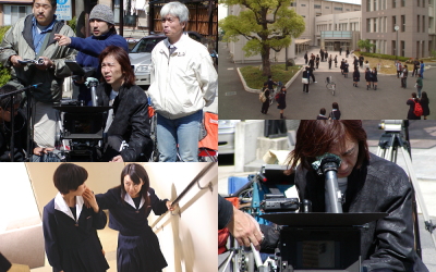 この日は、晴天に恵まれたクランクイン初日である。亜也さん(大西)が、高校から養護学校に転校する、分岐点の撮影である。撮影場所は、岡崎養護学校の校門前。スタッフらも、気を引き締め周囲に緊張が走る。岡村監督(中央・帽子姿)も、初メガホンとあり、入念なチェックをしていた。
